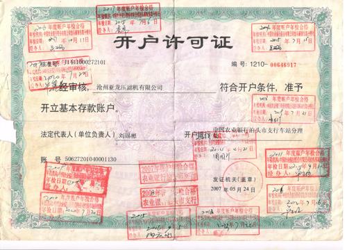 開戶許可證-滄州亞龍壓濾機有限公司