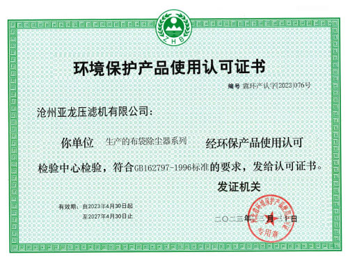 環境工程設計認定證書-滄州亞龍壓濾機有限公司