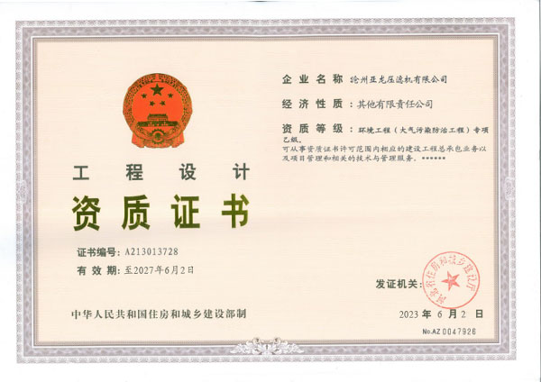 環(huán)境工程設計資質證書-滄州亞龍壓濾機有限公司