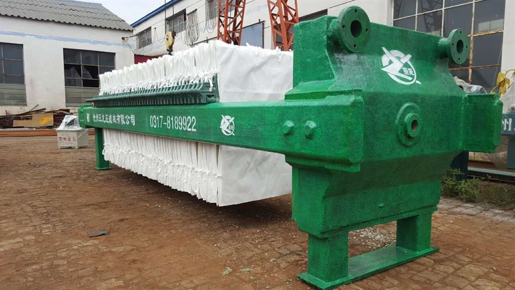 板框壓濾機主要由推力板(固定濾板)、壓縮板(移動式濾板)、濾板和濾架、橫梁(扁鐵框)、濾料(濾布或濾紙等)、壓實裝置、液體集箱等組成。